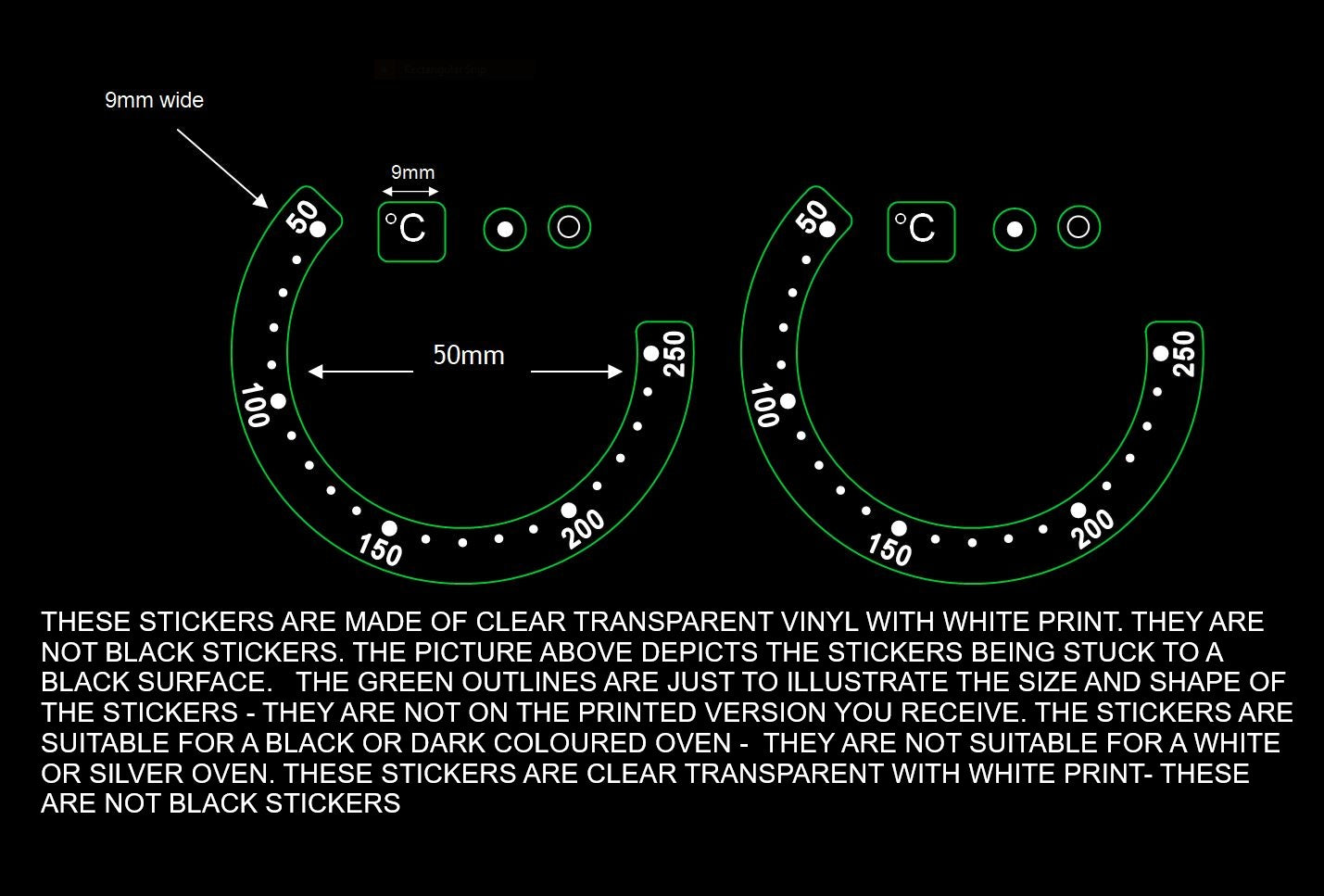 A pair of clear self adhesive laminated oven temperature stickers. The set comprises of 2 matching oven temperature dial stickers each with numbers 250-200-150-100-50 going in an anti clockwise direction There are also 6 small symbol stickers all in black print (for a white or silver oven) or white print (for a black oven). The inner diameter of the temperature dial is 50mm with a 68mm outer diameter (the sticker is 9mm wide). Please check the listing photos with measurements to ensure the design and numbering layout matches your appliance and the dimensions are suitable.