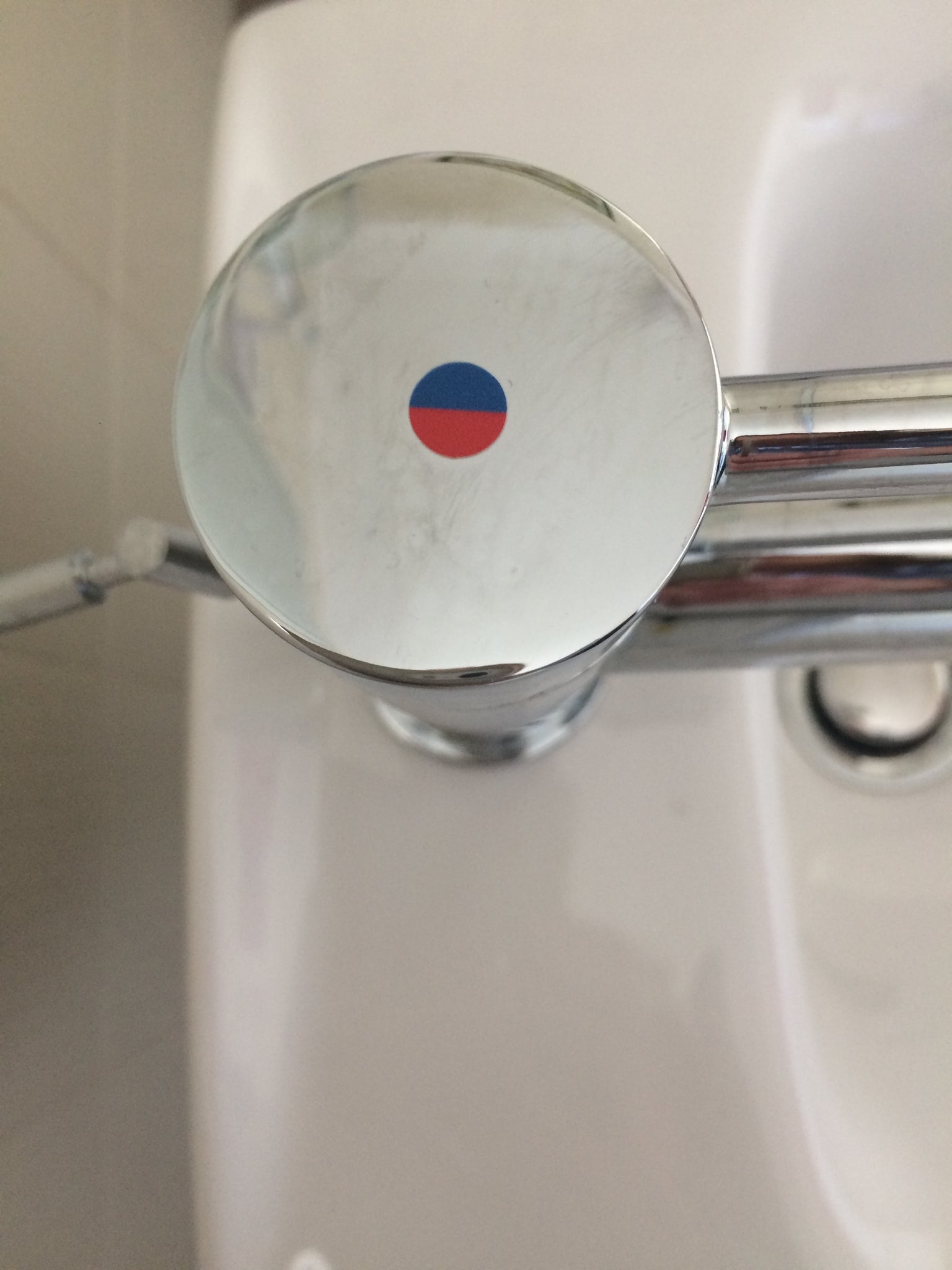 A set of 24 small round red and blue vinyl stickers that can be positioned anywhere on the tap/faucet as required. The stickers are .